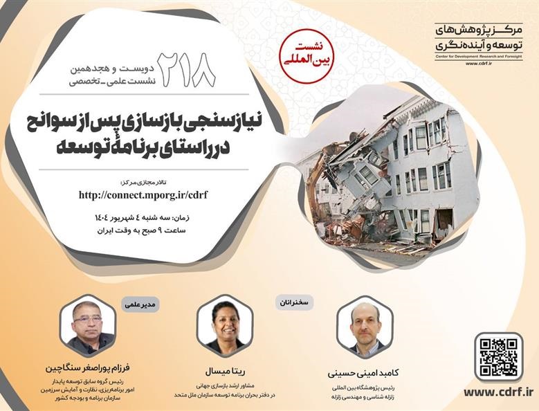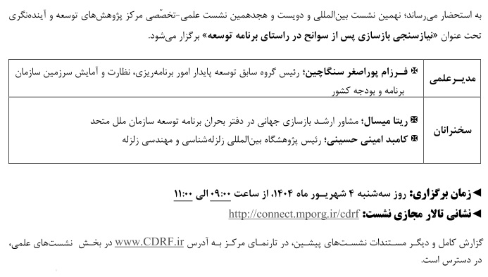 نشست علمی نیاز سنجی بازسازی سوانح در راستای برنامه توسعه ۰۳ شهریور ۱۴۰۴ | ۱۲:۳۷ کد : ۵۴۰۰۰ اطلاعیه ارسال به دیگران نام شما ایمیل شما ایمیل دریافتکننده ارسال انصراف تعداد بازدید:۱۳۳۲ نشست علمی نیاز سنجی بازسازی سوانح در راستای برنامه توسعه، توسط مرکز پژوهش های توسعه و آینده نگری برگزار می گردد.
